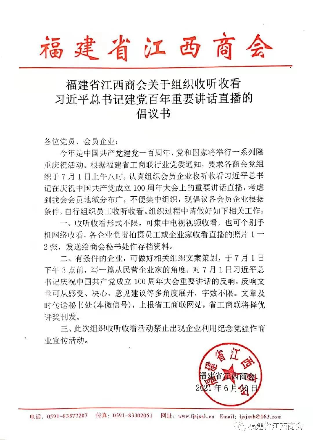 为了让在闽赣商更好地感受建党百年节日气氛,引领民营企业家爱祖国、感党恩、听党话、跟党走,福建省江西商会于6月30日,向全体会员发出组织收听收看总书记讲话的倡议书。倡议一发出,广大会员纷纷积极响应,以不同形式,做好各自企业团队收听收看准备。