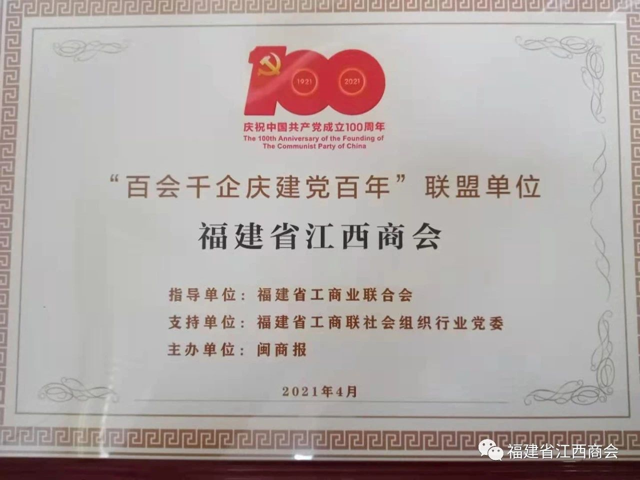 2021年4月16日上午,由福建省工商联发起、闽商报主办的“百会千企庆建党百年”活动启动仪式在福州上下杭全球闽商交流中心隆重举行。福建省工商联党组成员、副主席、省工商联社会组织行业党委书记陈建强,福建省工商联党组成员、副主席兼秘书长陈飚,福州市工商联党组成员、副主席陈曦,福州市工商联党组成员、秘书长何贞铨,省市工商联有关部室负责人及50余家商会代表出席活动。周高福秘书长代表福建省江西商会受邀出席活动,并上台接受“百会千企庆建党百年”联盟单位牌匾。