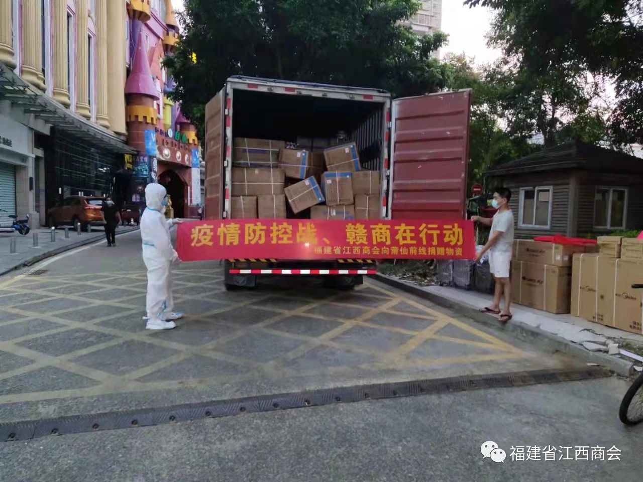 9月15日,在得知莆田疫情进一步爆发情况后,福建省江西商会会长张学霖、执行会长王红、监事长应卫峰、秘书长周高福等商会领导,紧急联系驻莆田当地的常务副会长吴奇旺、杨卫民,了解当地疫情信息,商议支援抗疫方案。在得知此次疫情中心的枫亭镇某村,急缺医疗和生活物资后,立即沟通拟定急缺物资清单,由商会筹集资金采购,并委托常务副会长吴奇旺、杨卫民、理事周培勇三人代表商会,将大批急需的防护装备、生活电器、食品饮料等物资,紧急送到抗疫一线,及时保障当地民众和抗疫工作人员的生活和安全。