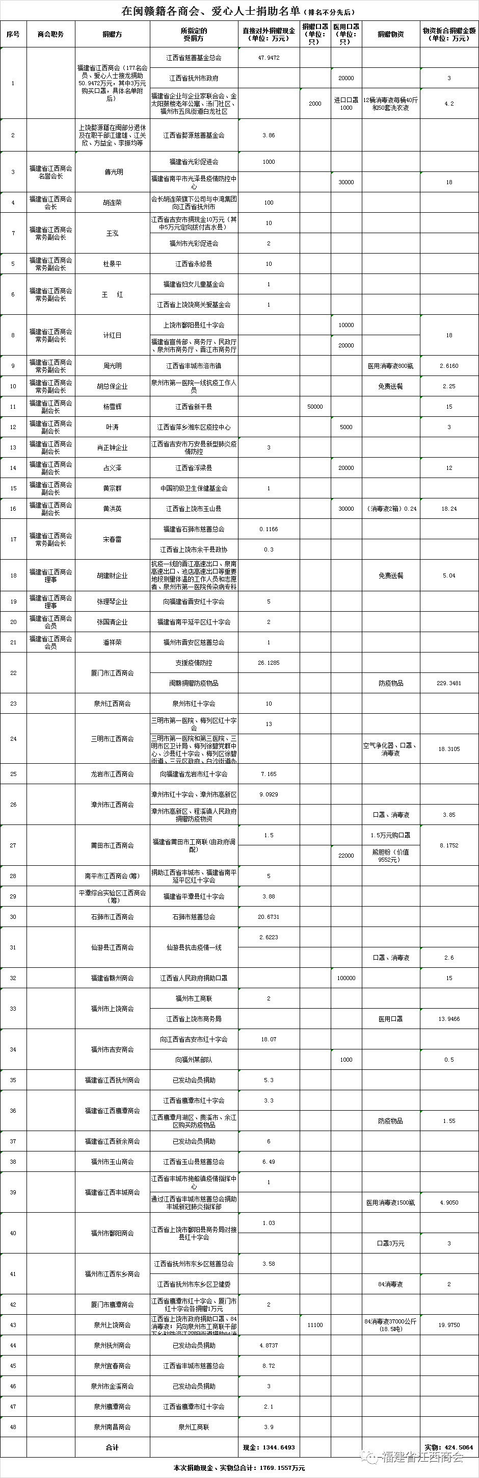 为响应中央和福建、江西各地市政府关于防抗新冠病毒肺炎传染工作的号召。根据胡连荣会长的指示和要求,1月 31日,福建省江西商会开始向广大在闽赣商、商会直属会员、团体会员等单位和在闽赣籍企业家发出《倡议书》,号召在闽各地江西商会发扬“厚德实干,利义天下”的新赣商精神,积极发动在闽各地赣籍商协会和在闽赣籍企业家根据防控所急所需,踊跃捐款捐物。截至2月17日,据不完全统计,福建省江西商会及在闽江西商会通过商会和其它渠道累计募集资金1400多万元,实物捐助口罩、消毒液等防护物资价值人民币约400多万元,合计捐助金额1800多万元,其中,福建省江西商会捐助现金1200多万元,实物50多万元。在闽赣籍商会26家,赣商企业及爱心人士3000多人参加了捐助活动,所捐现金、实物全部支持闽赣两省及武汉疫区防抗疫情使用。