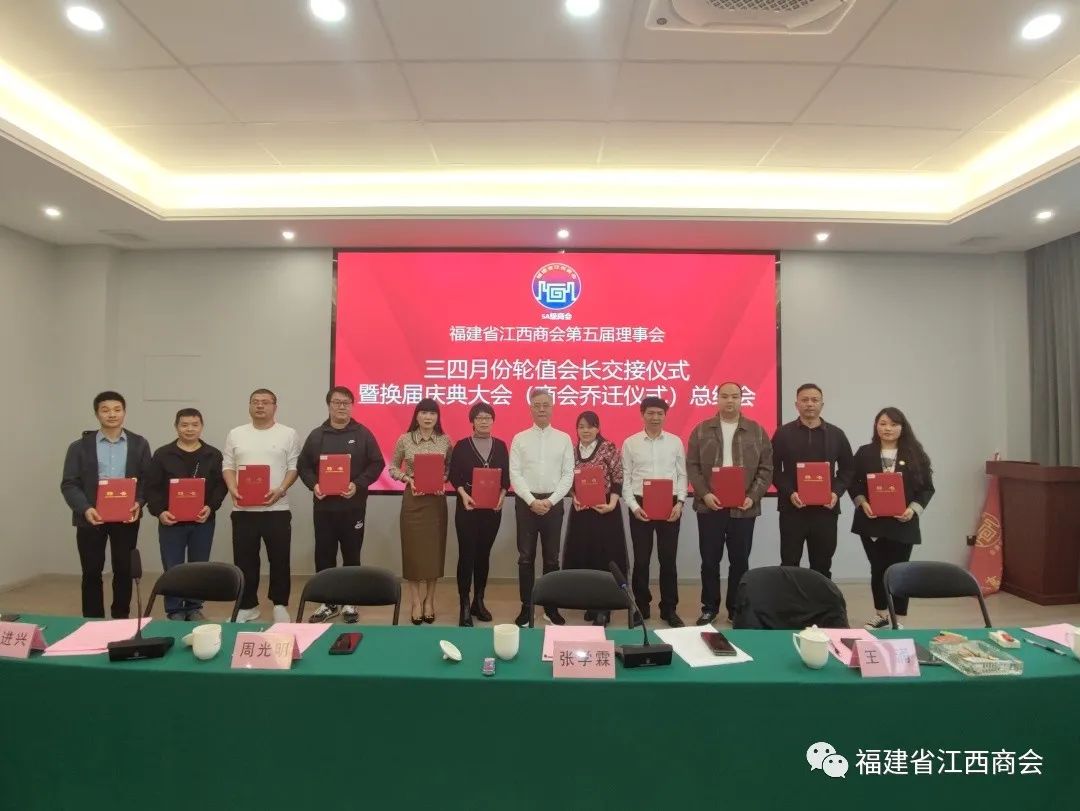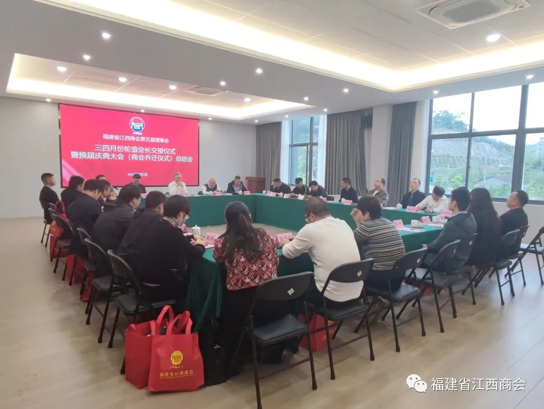4月3日,福建省江西商会第五届理事会三四月份轮值会长交接仪式暨换届庆典大会(商会乔迁)总结会在商会会议室顺利举行。会长张学霖,党支部书记兼秘书长周高福,常务副会长王涌、周光明、刘学军,三月份轮值会长李进兴、朱振记、叶萌、陈良锋、程金庭,四月份轮值会长周伟鸿、张炳煌、陈冬发,副秘书长曹卫华,商会联络员及秘书处工作人员等30余人参加了本次会议。
