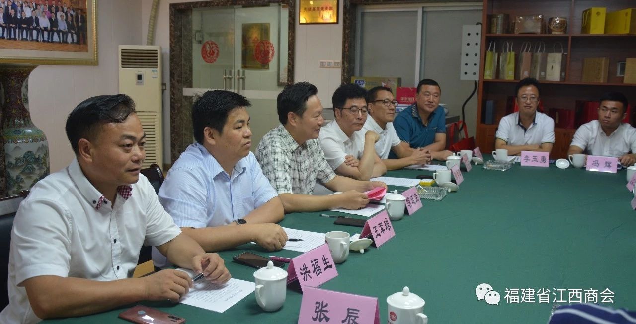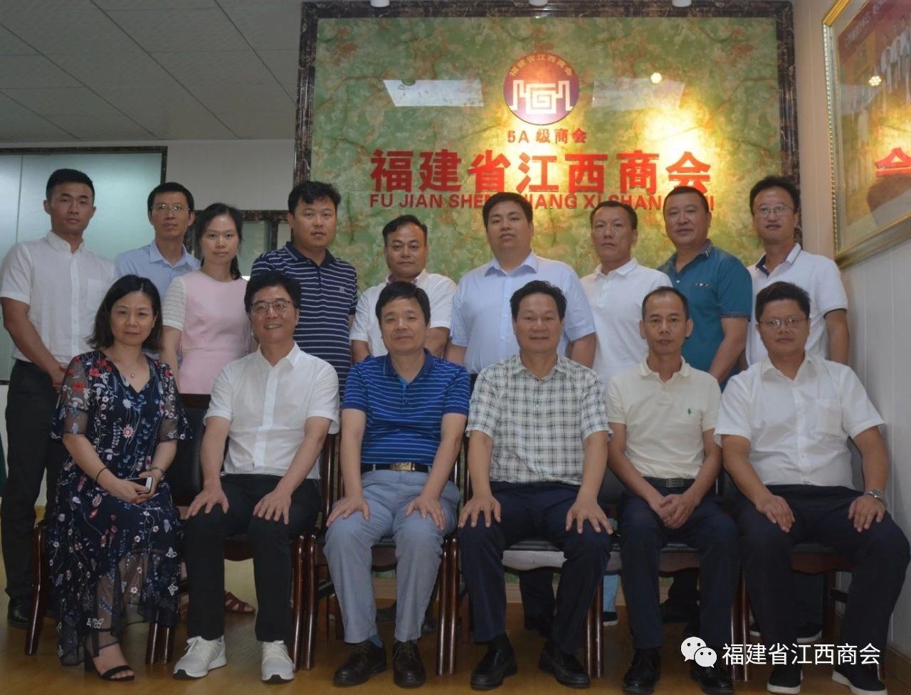 2019年8月8日,江西省工商联副主席洪跃平一行领导来到福建省江西商会考察指导工作,并与商会企业家亲切座谈。参加会议的有江西省工商联副主席洪跃平、经联处处长熊群运,江西省市场监管局正处级干部胡智政,江西省商务厅国内合作处调研员曾红蕾,江西省工商联办公室副主任付明、经联处副主任科员杨文俊,江西省工商联江西民营企业创新中心主任陈鹏,副主任冯辉,福建省江西商会会长胡连荣,执行会长张学霖,党支部书记、常务副会长王军球,轮值会长、常务副会长李进兴,轮值会长、常务副会长洪福生,秘书长周高福,副秘书长李玉勇,会议由执行会长张学霖主持。